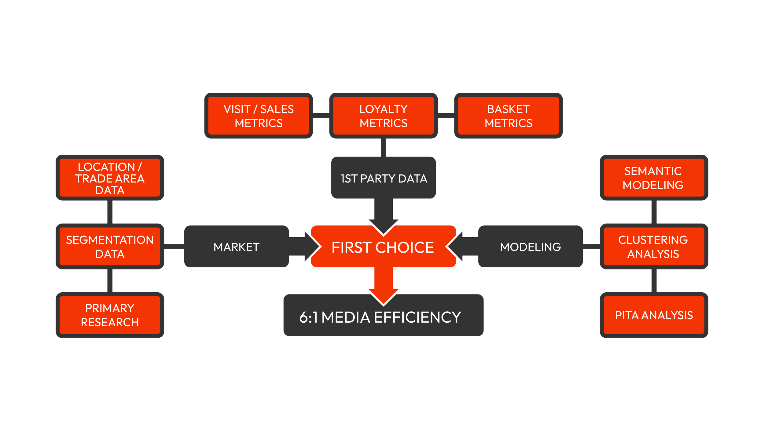 Our First Choice framework turns information into actionable clarity; we help brands understand the real drivers of preference, connecting these to next best dollar actions and then translating this into clear, marketing action.