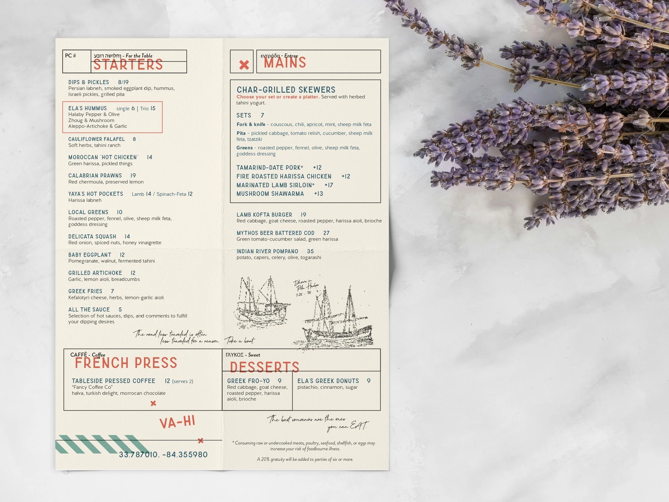 Tucked away in the vibrant heart of Va-Hi in Atlanta, Ela Mezze + Spirits serves up a culinary voyage through the Mediterranean with an inviting, creative twist. A tribute to the diverse tapestry of the region, where every bite tells an ancient story of tradition, trade and cultural exchange influenced by travels from Morocco to the Levant -- and back. We were honored to craft the 7th brand in the Fifth Group’s hospitality portfolio. FGR took cues from the entire mediterranean region to create a unique culinary experience. We followed their lead to design an identity system as unique as the food itself.